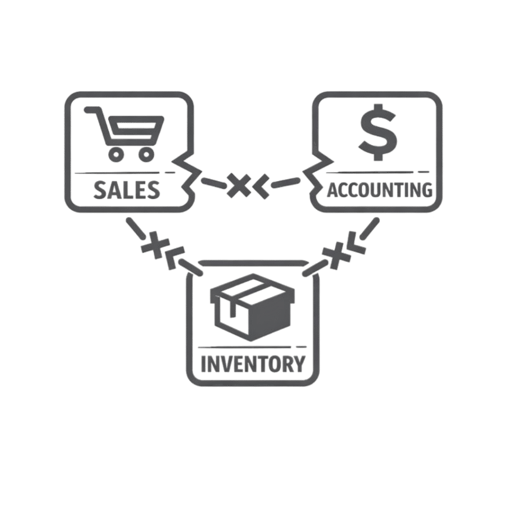 Disconnected tools create data mismatches between billing, stock, and financial records.